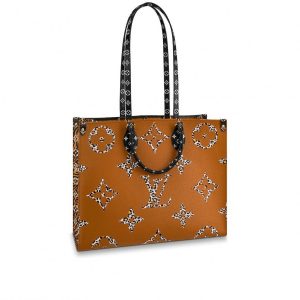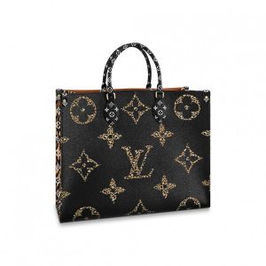 The Onthego tote bag takes on a bold new look in coated canvas with a print combining multiple sizes of the Monogram motif with leopard and zebra skin patterns. Its generous capaci..