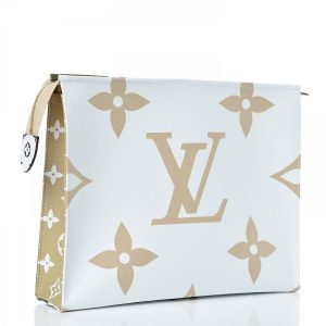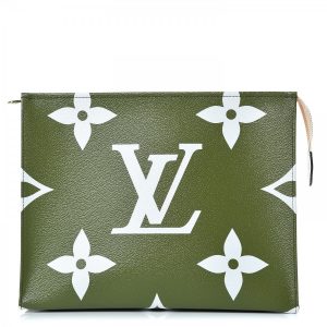 This large limited edition accessory travel case is crafted of different sizes of monogram canvas in beige, green, and white. The top brass zipper opens to a beige leather-like int..